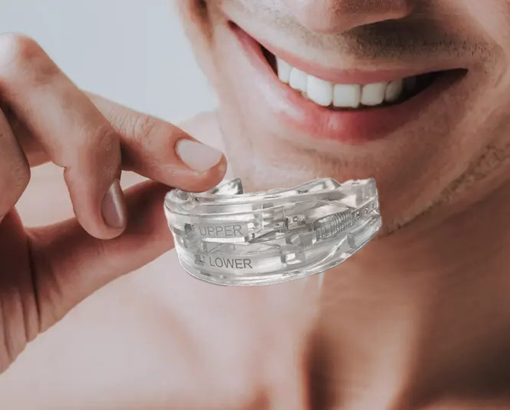 The mouthpiece gently shifts your lower jaw forward, preventing airway blockage and reducing snoring for a quiet, restful sleep.